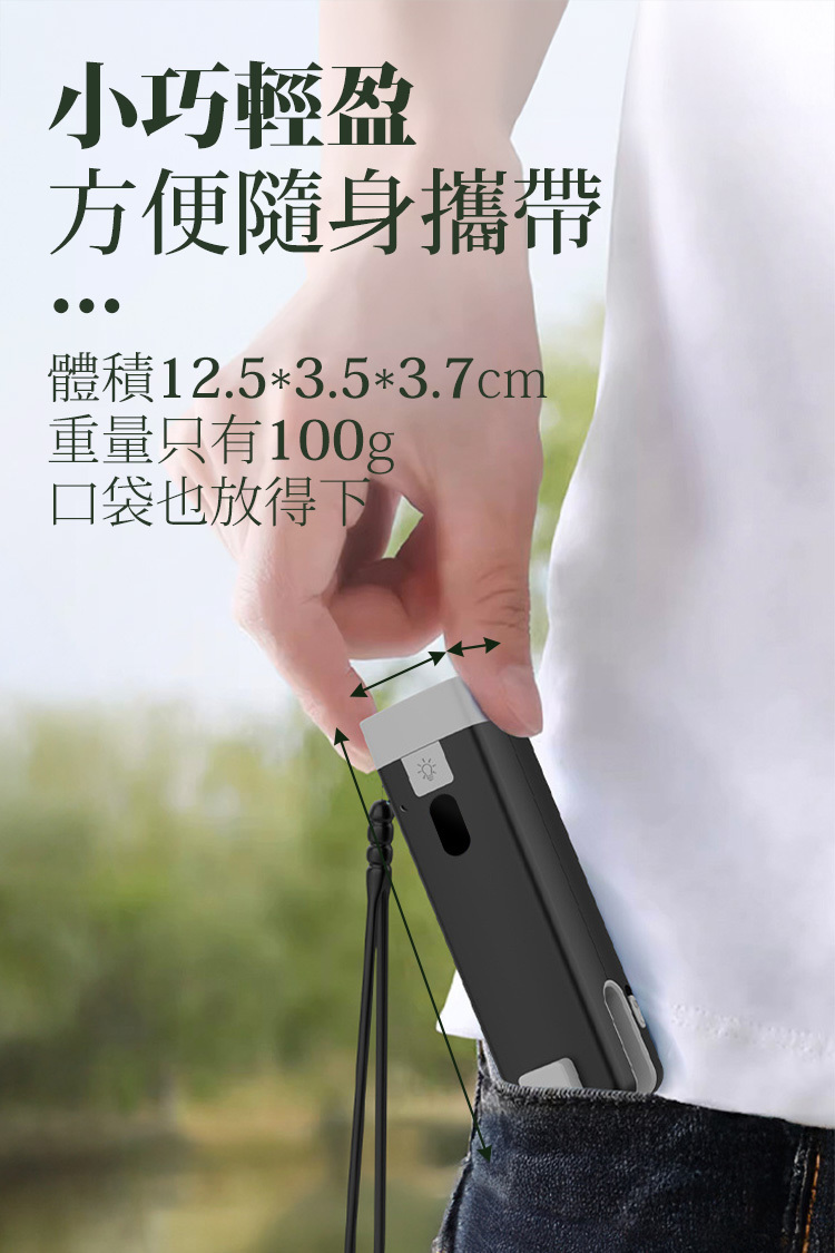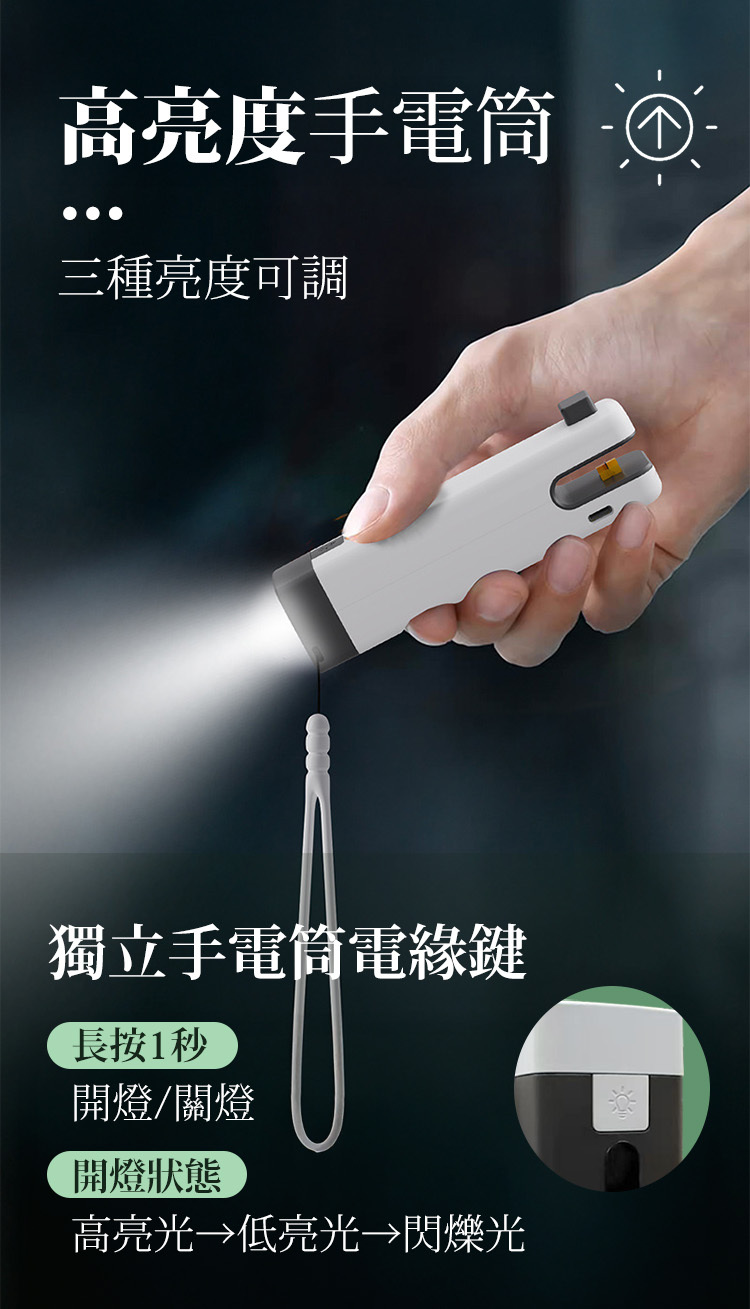手電筒:長按開關燈,於開燈狀態下短按1下可切換燈光模式。
