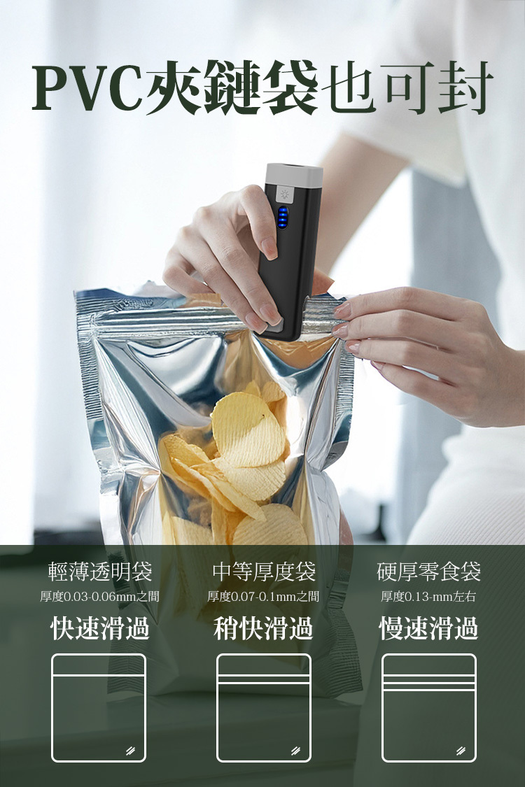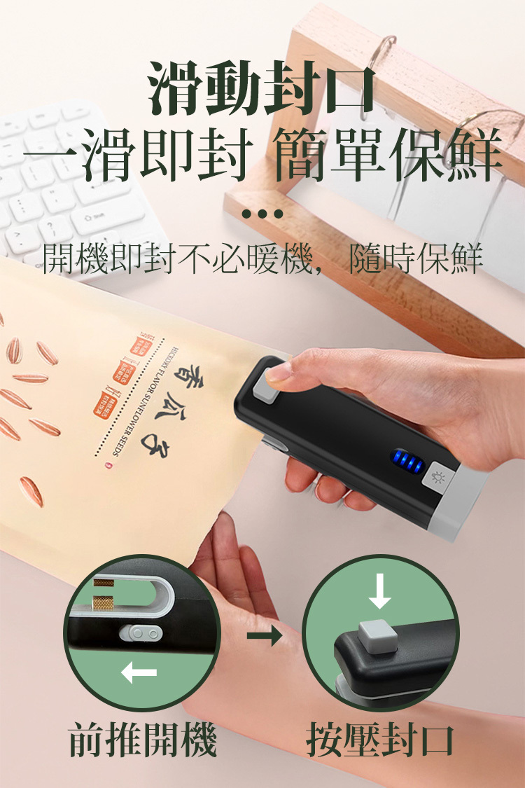 封口模式:打開電源,輕壓滑動即可完成封口。