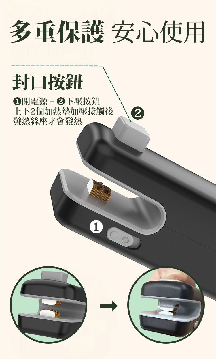 請勿將手指伸入封口加熱槽中,以免燙傷。