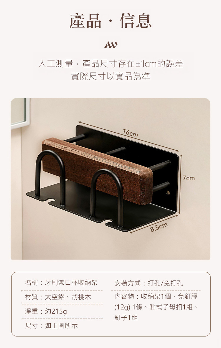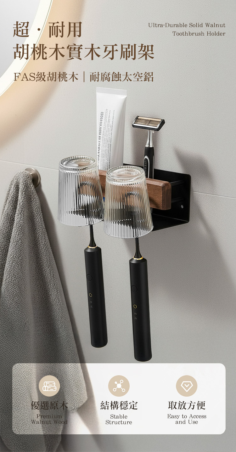 這款牙刷架融合了天然胡桃木與耐用的太空鋁