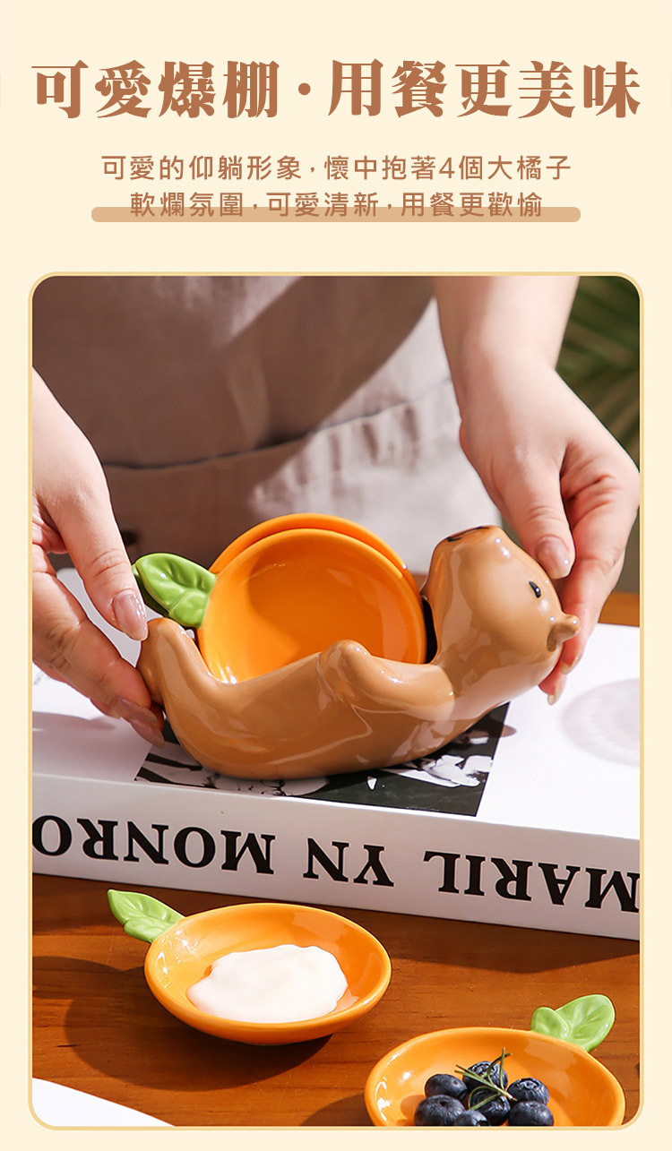 慵懶仰躺的姿態配上可愛橘子小碟,