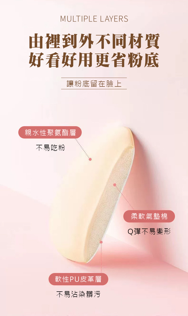 高質材料 — 使用聚氨脂材質,微米級氣孔海棉,不易吃粉。