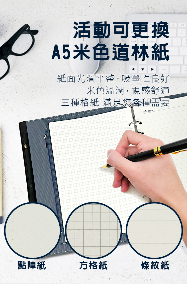 內附三種可替換的米色道林紙——橫條紋、點陣紙和格紋紙,