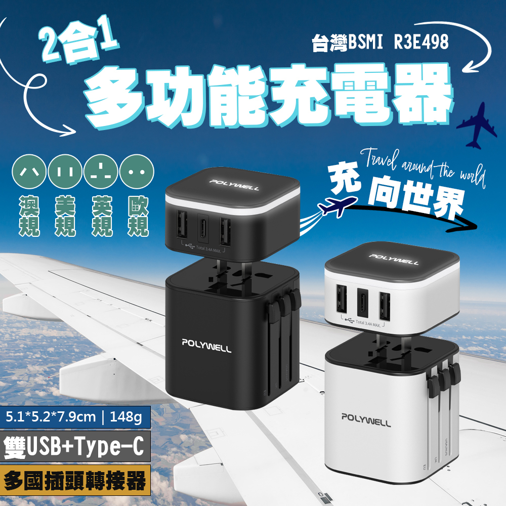 - 充電器有2孔USB和最新Type-C埠, 可以為您旅遊設備一次同時充電
