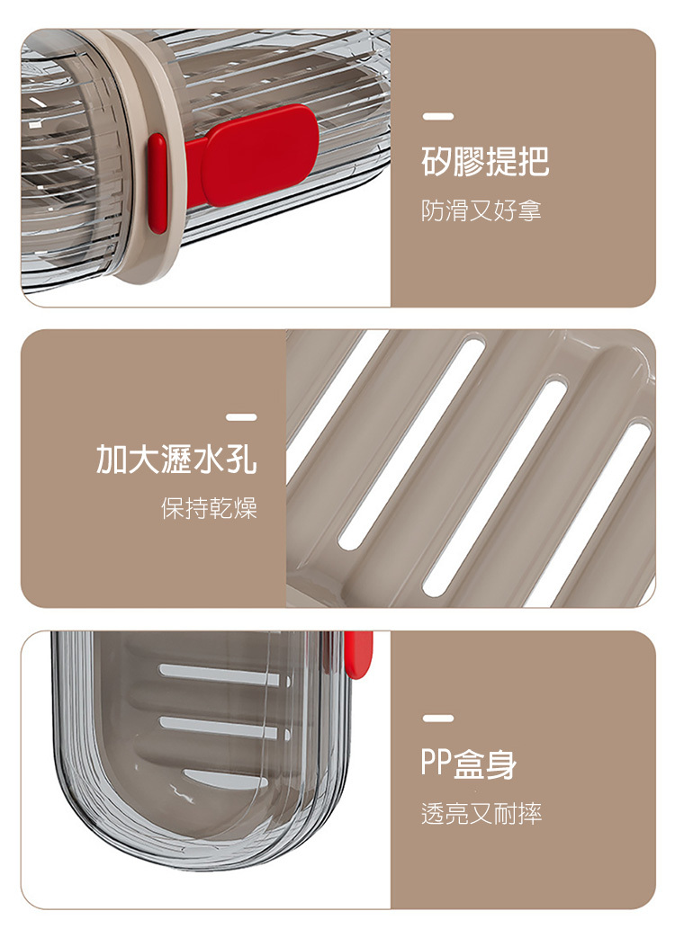 ①外盒的凹凸槽搭配②醒目的紅色矽膠提把,穩固不滑落。